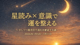 未分類 🔮星読み✕意識で運を整える🌈2026年1月第2週(1/5〜1/11) 星読み✕意識で運を整える(2026年1月5日〜1月11日)習慣スピリチュアルガイド。今週は「少しづつ動き出す週」をテーマに解説。心の整え方、ラッキールーティン、開運ポイント、気をつけることなど解説してます。 2026.01.02 未分類